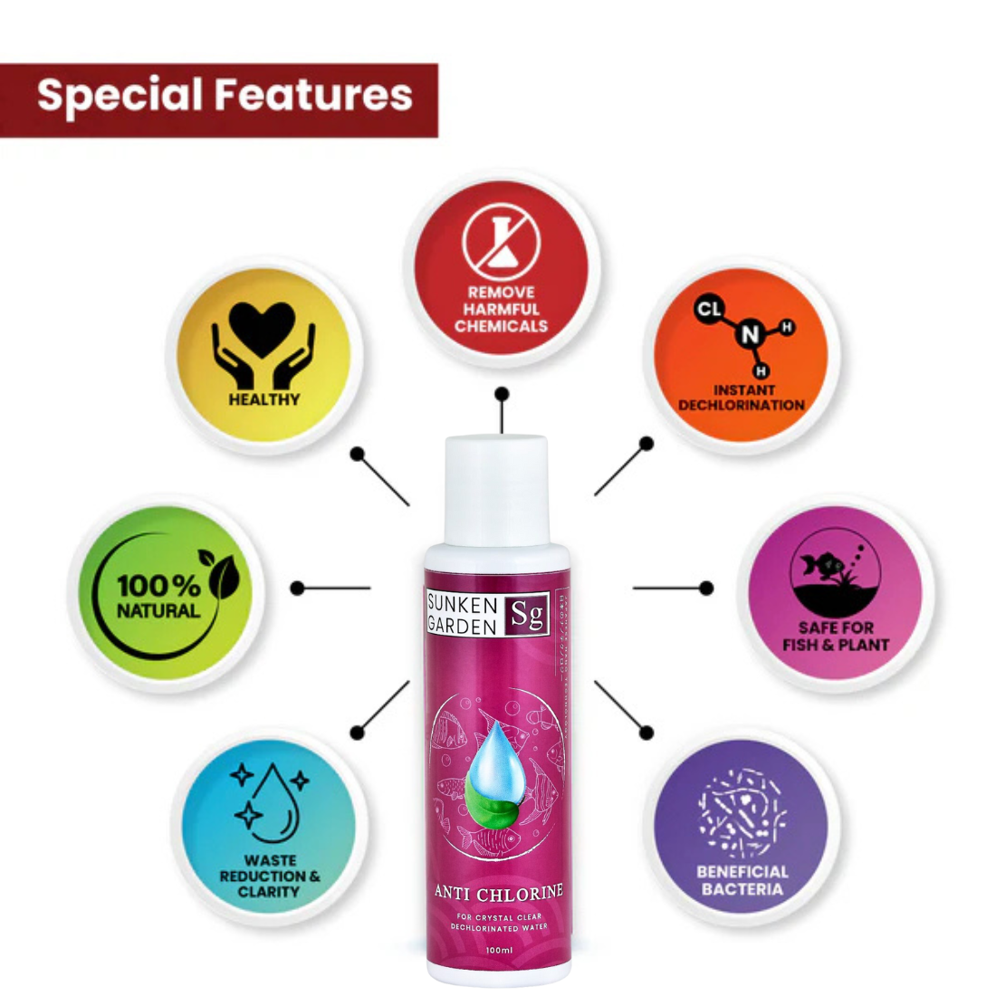 SUNKEN GARDEN ANTI CHLORINE 100ML is a powerful, all-in-one water conditioner that instantly makes tap water safe for your fish and plants. It not only removes harmful chlorine, chloramine, and heavy metals but also introduces 15 potent strains of beneficial bacteria—each carefully selected to promote biological balance and reduce toxins like ammonia and nitrite.